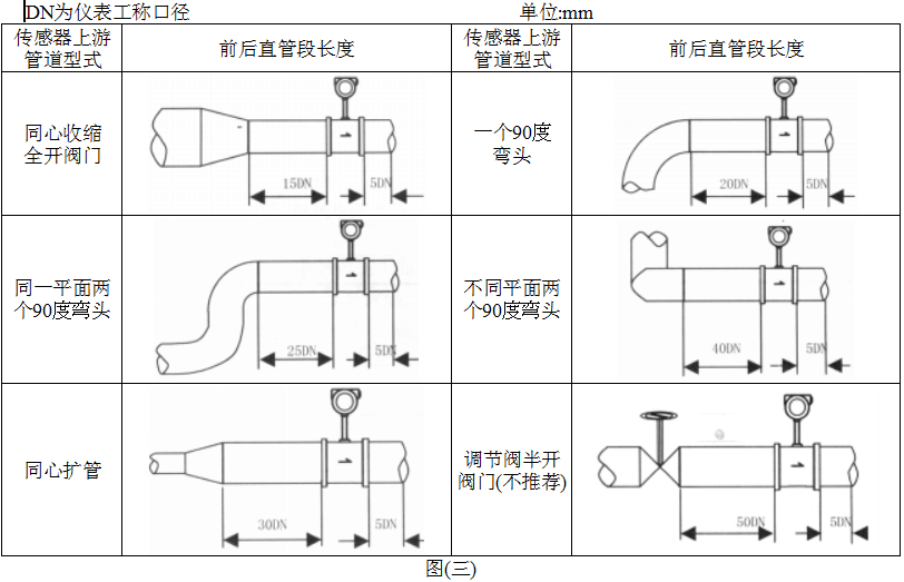 1. 渦街流量儀表對安裝點(diǎn)的上下游直管段有一定要求,否則會(huì)影響介質(zhì)在管道中的流場,影響儀表的測量精度。儀表的上下游直管段長度要求見圖(三)