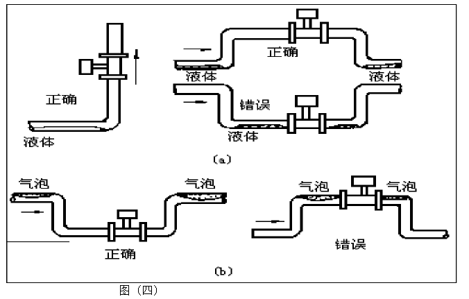 5. 測量氣體時(shí),在垂直管道安裝儀表,氣體流向不限。但若管道內(nèi)含少量液體,為了防止液體進(jìn)入儀表測量管,氣流應(yīng)自下而上流動(dòng),如圖(四)a所示
